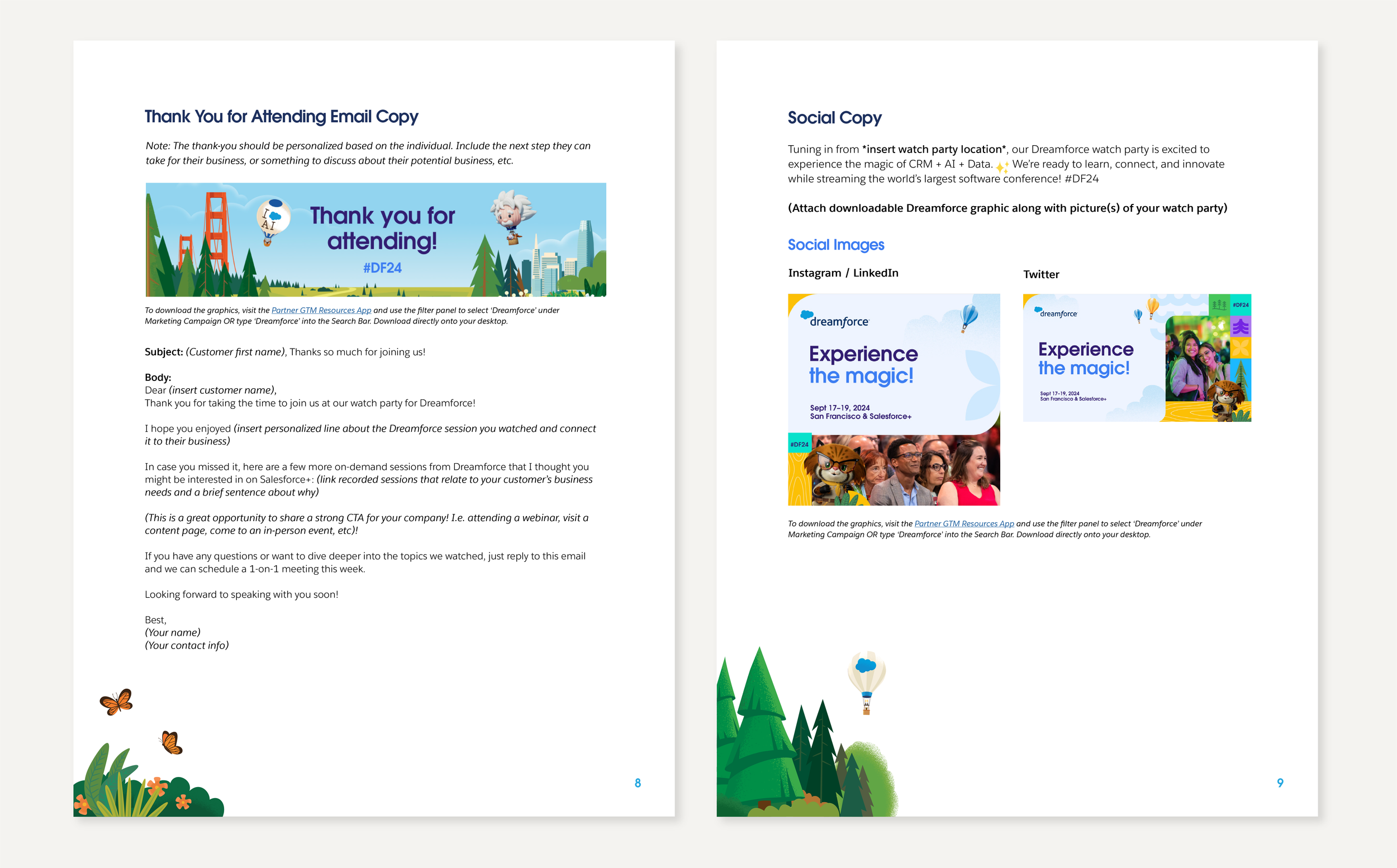 From email templates to checklists and social-ready graphics, the playbook brought everything together in one polished, accessible format—designed to help partners create their own memorable Dreamforce experiences.